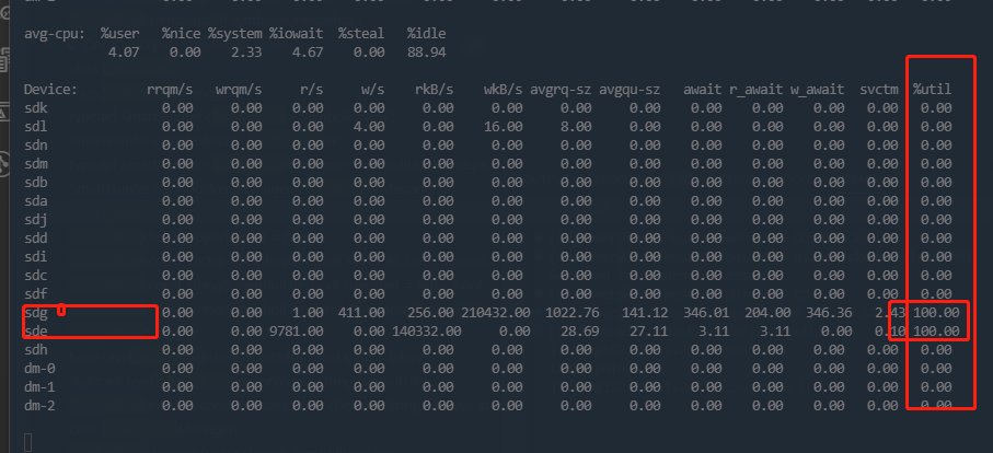 特别注意最后一列利用率, 如果100或者接近,说明可能达到了磁盘的瓶颈。