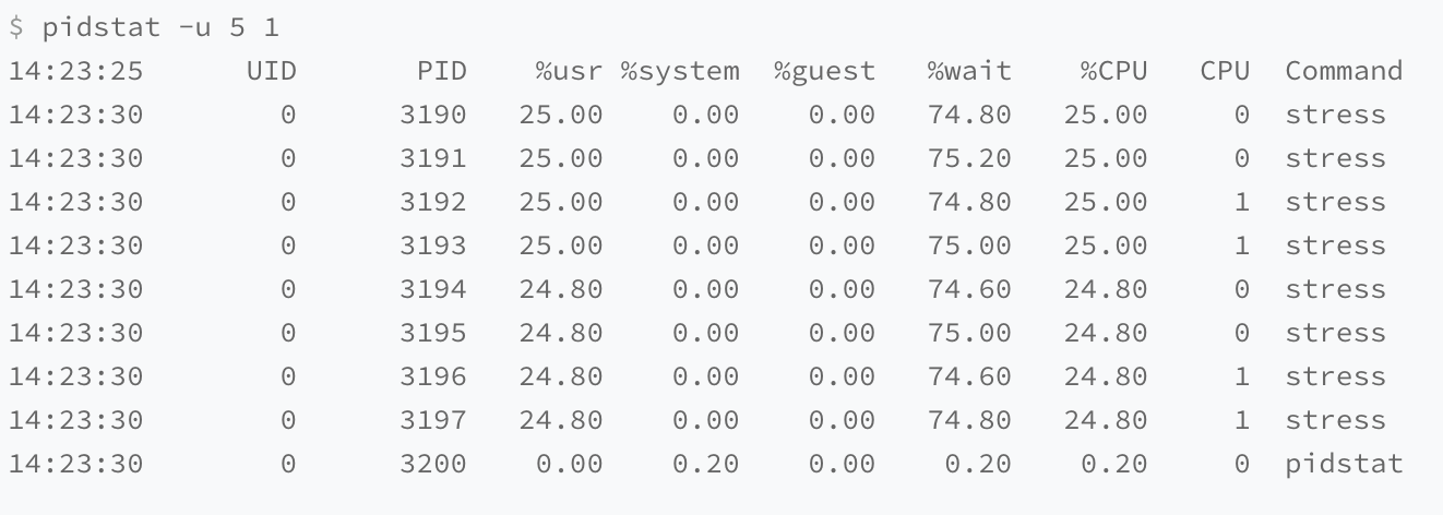 可以看出,8 个进程在争抢 2 个 CPU,每个进程等待 CPU 的时间(也就是代码块中的 %wait 列)高达 75%。这些超出 CPU 计算能力的进程,最终导致 CPU 过载。