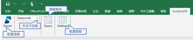 下图展示了 DolphinDB Excel Add-In 的使用界面。从左到右的图标分别表示连接配置、连接节点选择、SQL 查询面板、插件功能配置。