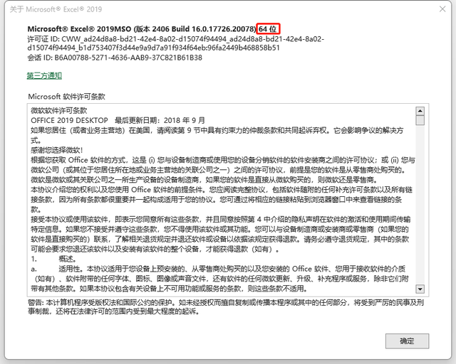 注意:Excel 的 32/64 位版本信息可以在 Excel 的“文件”->“账户”->“关于Excel”里找到。