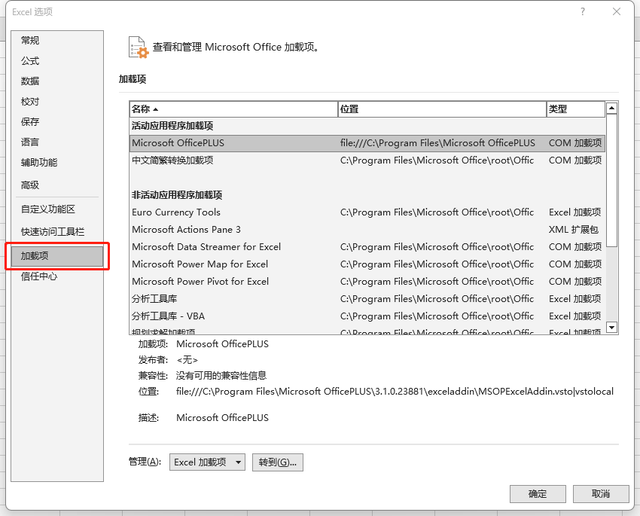 (7)更新插件时,在 Excel 中依次单击“文件”->”选项“->”加载项”->”转到”,取消勾选原加载项,点击确定,并关闭选项框。