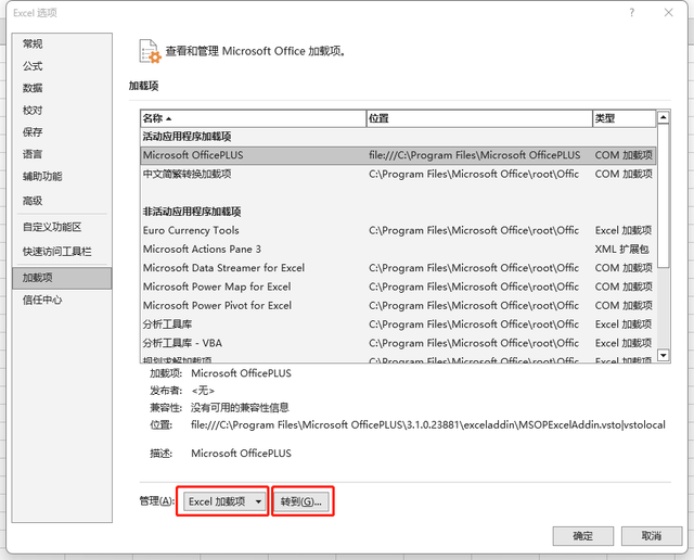 (3)在”管理”栏中选择“Excel 加载项”,然后单击“转到”。