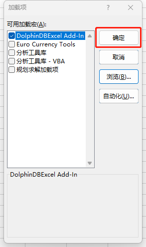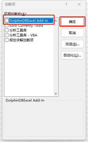 (5)系统自动返回加载项界面,选中刚刚导入的“DolphinDBExcel Add-In”。