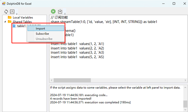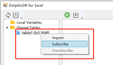 支持订阅 DolphinDB 中流表的数据。操作示例如下:
