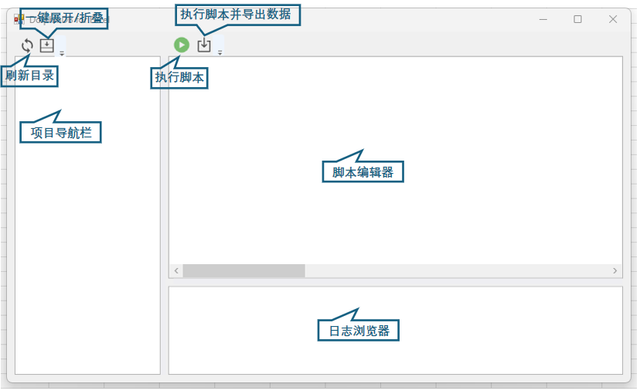 查询面板主要由菜单栏、项目导航栏、脚本编辑器和日志浏览器组成。其中菜单栏以图标的形式展示,鼠标放置时会弹出文本解释,从左到右依次为“Refresh”“Expand/Collapse”“Excute”“Excute & Import”。