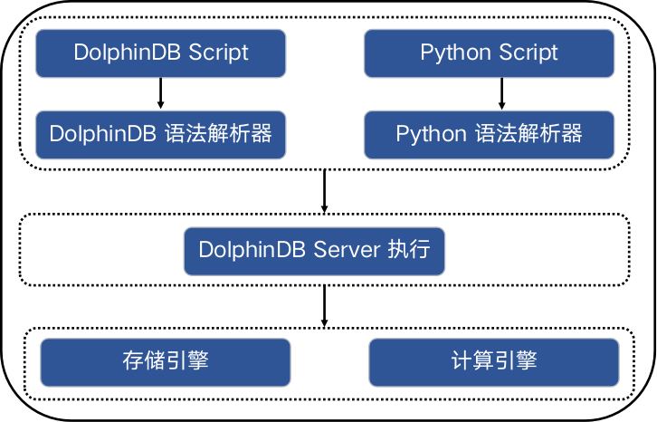 Python Parser 是 Python 语言的一个 DolphinDB 实现,为基于 Python 语言编写的脚本提供了执行环境。与传统的 Python 不同,Python Parser 不受全局锁 GIL(Global Interpreter Lock)的限制,因此能够充分发挥多核和分布式计算的潜力。Python Parser 与 DolphinDB 脚本共享对象系统和运行环境,这使得 Python Parser 具备直接控制 DolphinDB 存储引擎和计算引擎的能力,并能直接使用 DolphinDB 中的内置函数。此外,还实现了 Python Parser 的第三方库:pandas。下图展示 DolphinDB 系统内部的简略结构。