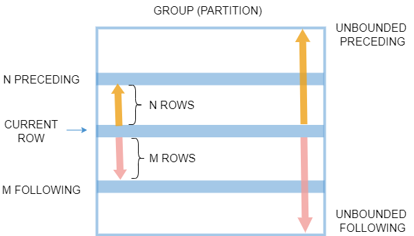 ROWS | RANGE n PRECEDING等价于ROWS | RANGE BETWEEN n PRECEDING AND CURRENT ROW -