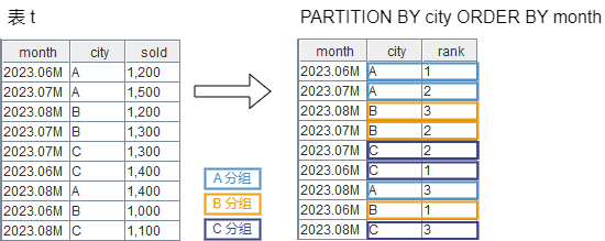 rank() OVER (PARTITION BY city ORDER BY month) AS rank