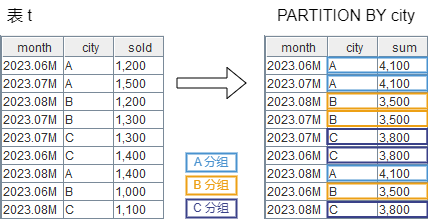sum(sold) OVER (PARTITION BY city) AS sum