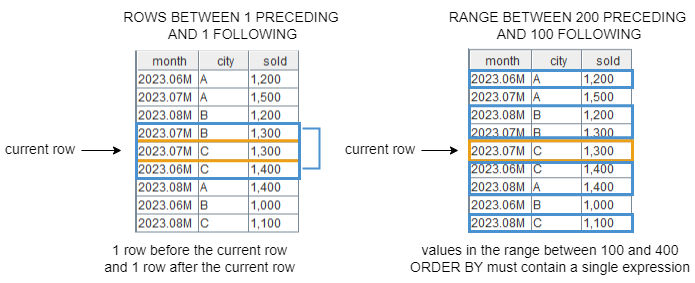 RANGE 根据 ORDER BY 列的行值来确定窗口的范围。必须指定 ORDER BY 子句,且该子句只能包含一个表达式。此时 n 可以是整数或 DURATION。当 n 是整数时,其单位和 ORDER BY 列相同;当 n 是 DURATION 时,它是一个时间间隔,其精度不能高于 ORDER BY 列的时间精度。以 n 为整数为例,RANGE BETWEEN 200 PRECEDING AND 100 FOLLOWING 表示当前行的值减200和当前行的值加100之间的所有行,包括相同排序值的行。