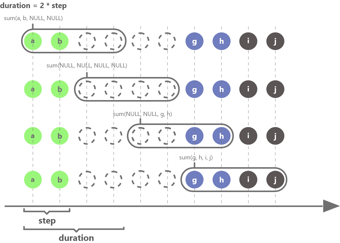 下图以 duration = 2 * step 为例,进一步解释插值窗口如何进行滑动计算(结果为 NULL 的窗口需要根据 fill 参数指定的方式进行填充):