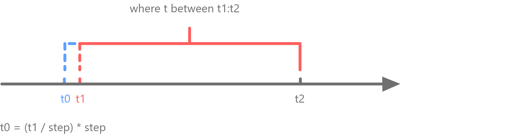 下图解释了 explicitOffset 不同设置下,插值起始窗口如何确定。图中 where 条件指定起始值为 t1,t1 前最近的一个能被 step 整除的值为 t0,当 explicitOffset 设置为 true 时,插值起始窗口以 t1 开始,当 explicitOffset 设置为 false 时,插值起始窗口以 t0 开始。