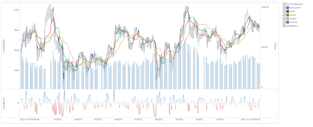 例如,使用 DolphinDB 流计算引擎搭配 Panopticon 可视化应用搭建价格分析仪表盘,可以将 K 线、移动平均指数、交易量等信息组合在一张图中,快速查看市场整体趋势或关键指标。