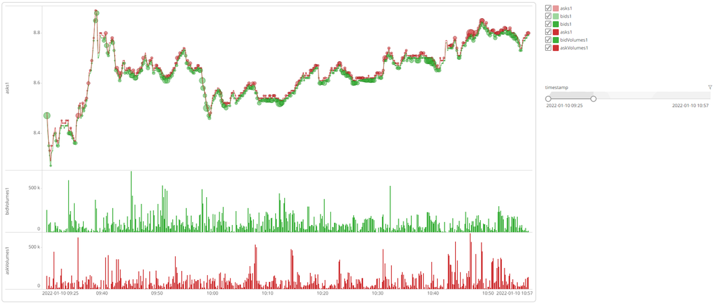 用 DolphinDB 和 Altair Panopticon 共同搭建的高性能时序数据分析平台包括了 SQL 查询和流数据表订阅两种数据接口,用户能够访问和分析实时流数据、日内累计数据和历史数据,并对接收到的数据实时地进行可视化展示。直观易懂的操作流程让用户可以快速地掌握使用方法,在几分钟内连接到数据源,设计一个自动刷新的可交互仪表盘并将其发布,以供交易、分析、监控等相关人员使用。