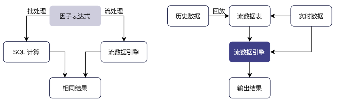 流批一体是指将研发环境中基于历史数据建模分析得到的因子或表达式直接应用于生产环境的实时数据中,并保证流计算的结果和批量计算完全一致,二者使用同一套代码,称为“流批一体”。