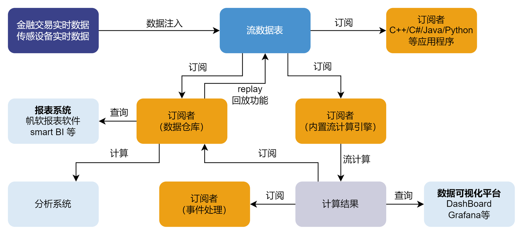 流数据表可由数据仓库订阅并保存,作为分析系统与报表系统的数据源。