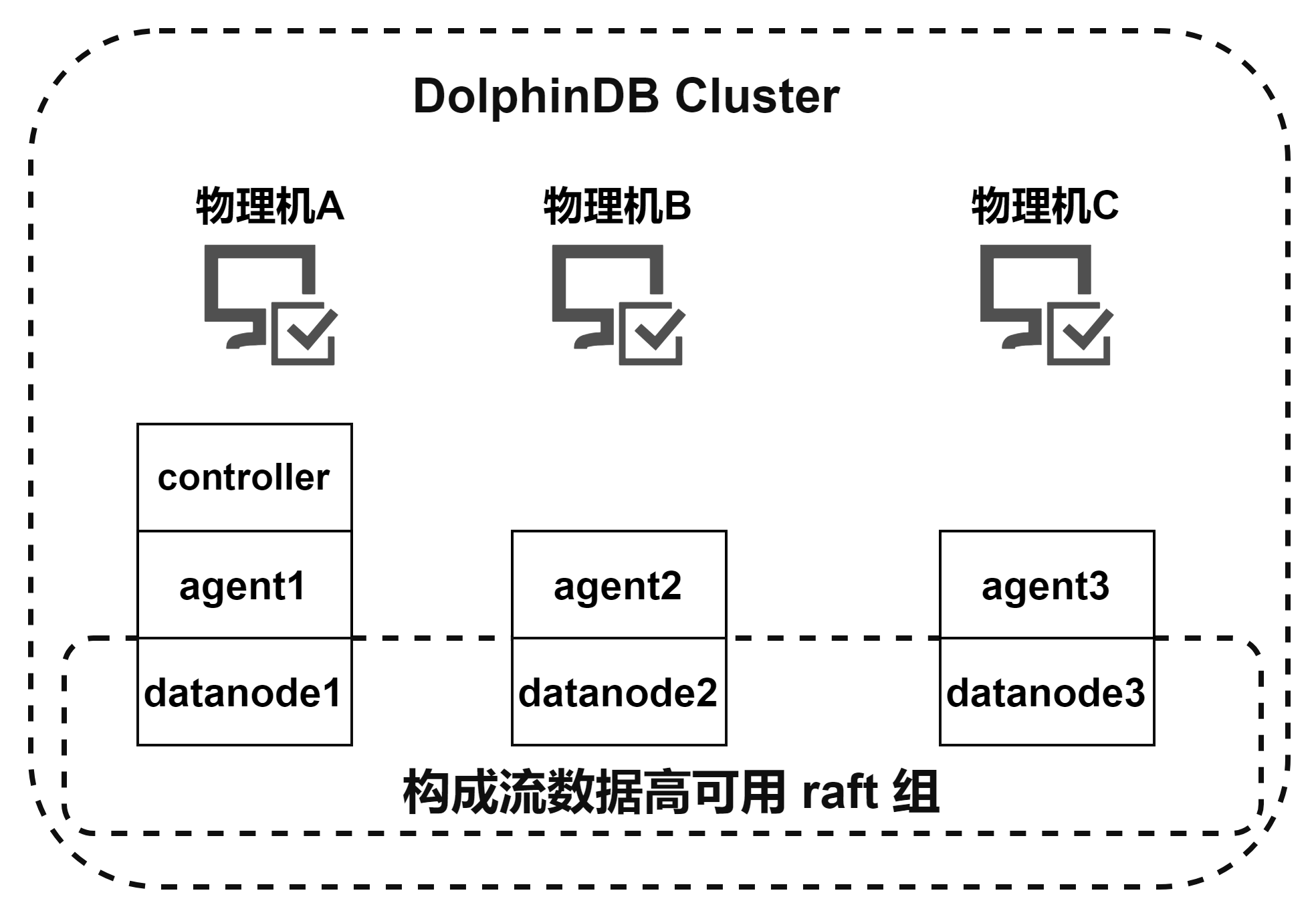 在启用流数据高可用功能前,需要先在多个服务器上部署 DolphinDB 集群(目前高可用功能仅在集群中支持,在单节点模式中不支持),然后根据流数据教程配置相关参数,再创建高可用流数据表。