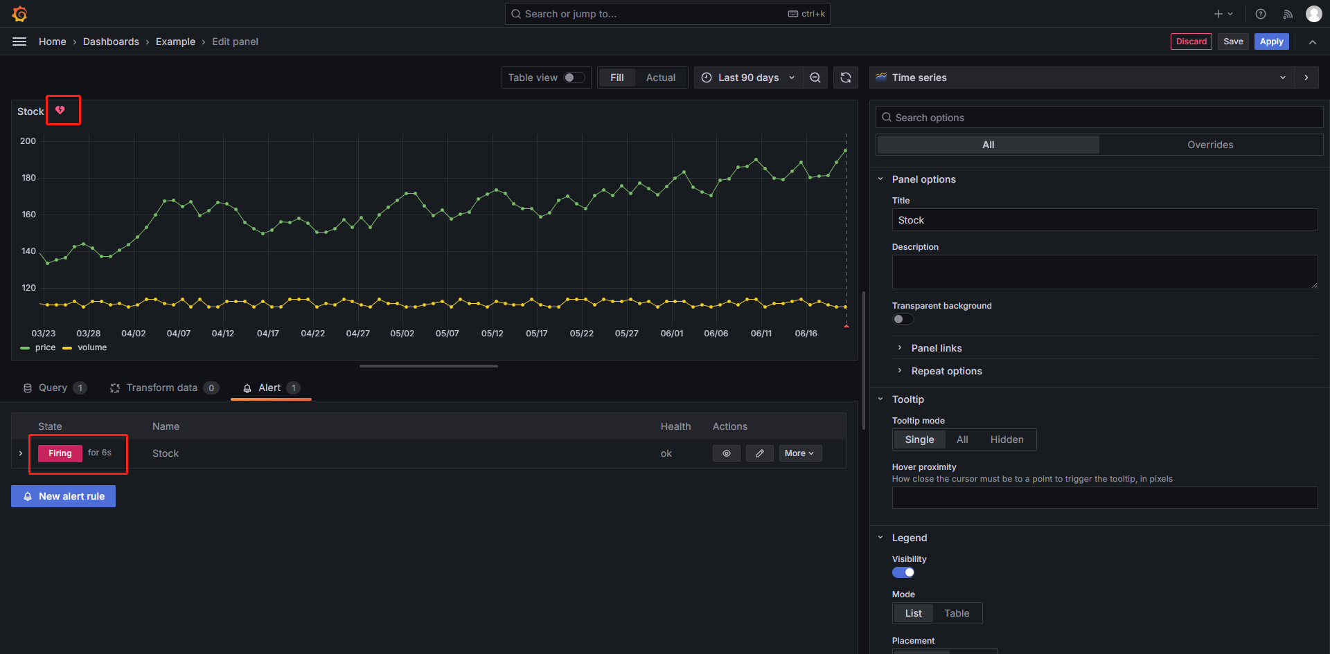 当告警条件满足时,警报被触发。警报的状态变为 Firing,并且 Panel 的状态变为“alerting”,在 Panel 旁边的图标将显示为一个红色的告警图标。