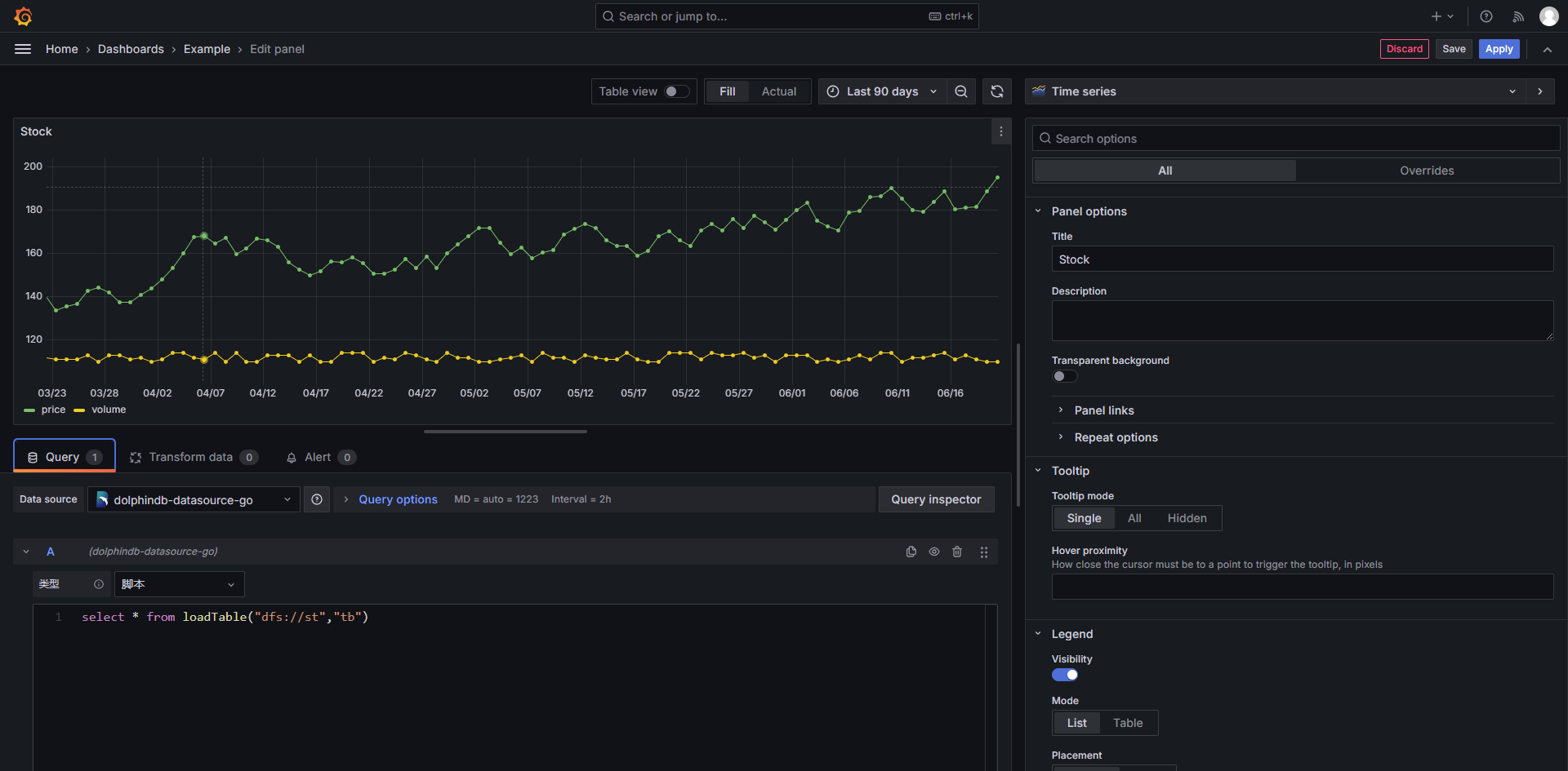 DolphinDB 特别提供了 dolphindb-datasource-next 数据源插件。该插件使用 Go 语言编写,运行在 Grafana 后端,支持用户在 Grafana 面板上实现 DolphinDB 时序数据的可视化。
