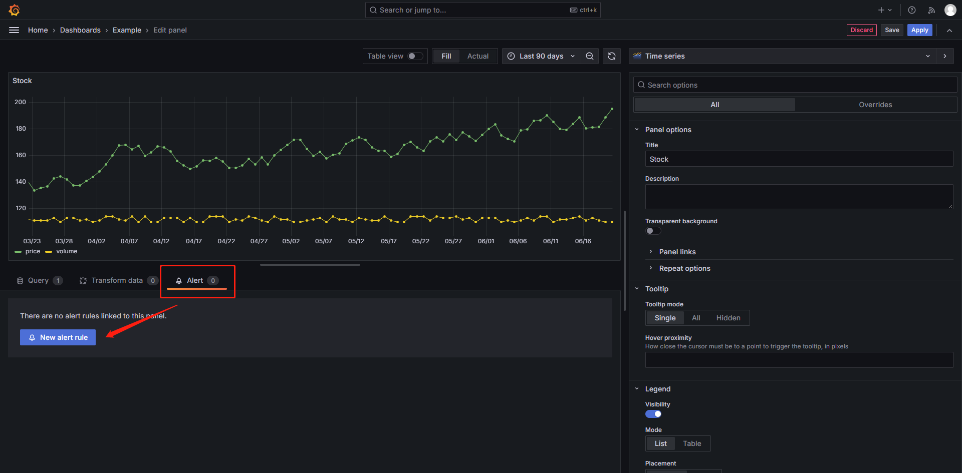 找到面板下方的 Alert 标签页,并选择创建 Alert