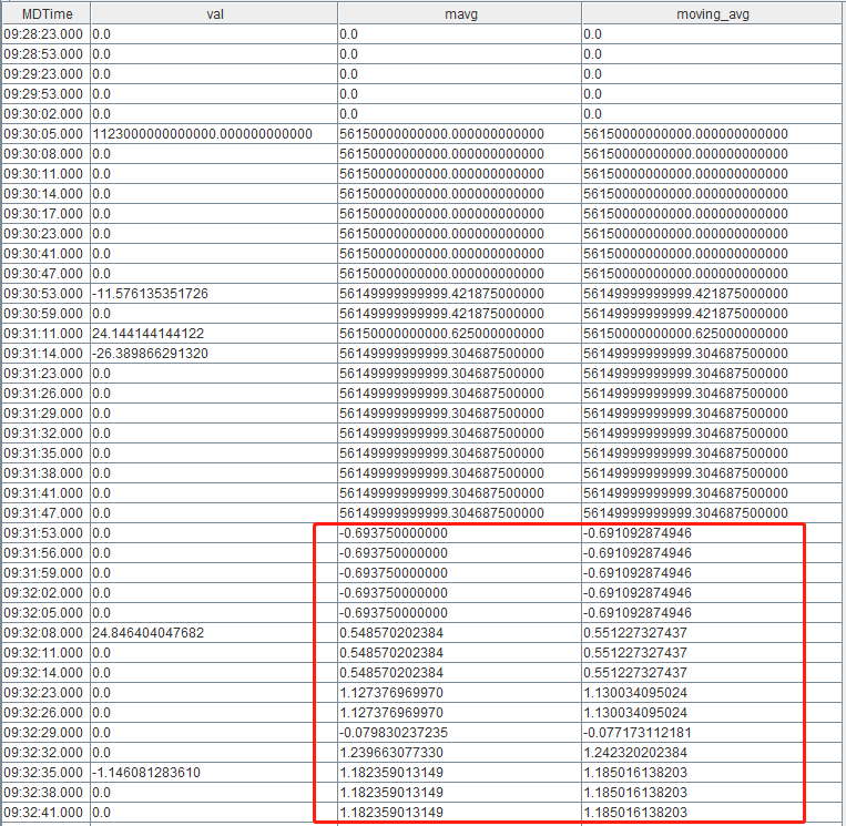 mavg 和 moving(avg,…) 虽然在含义上完全相同,但两者的实现方式并不一致。mavg 的算法是:随着窗口的移动,总和加上进入窗口的数,减去离开窗口的数,再计算 avg,所以在这个加减的过程中,会产生浮点数精度问题。
