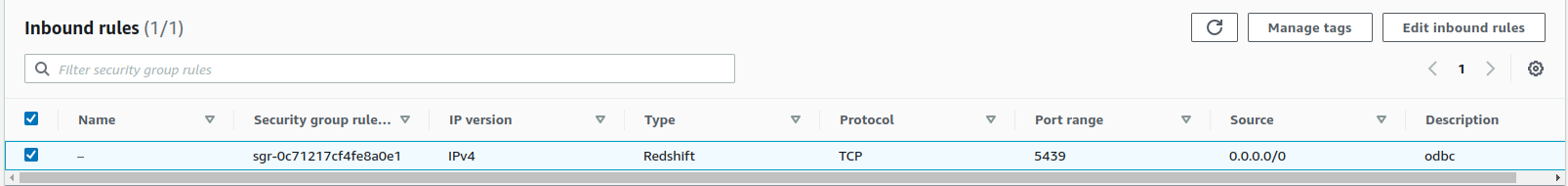 /etc/odbc.ini文件中[Redshift] Driver=Amazon Redshift (x64); Server=Your server; Database=Your database数据库安全组开放