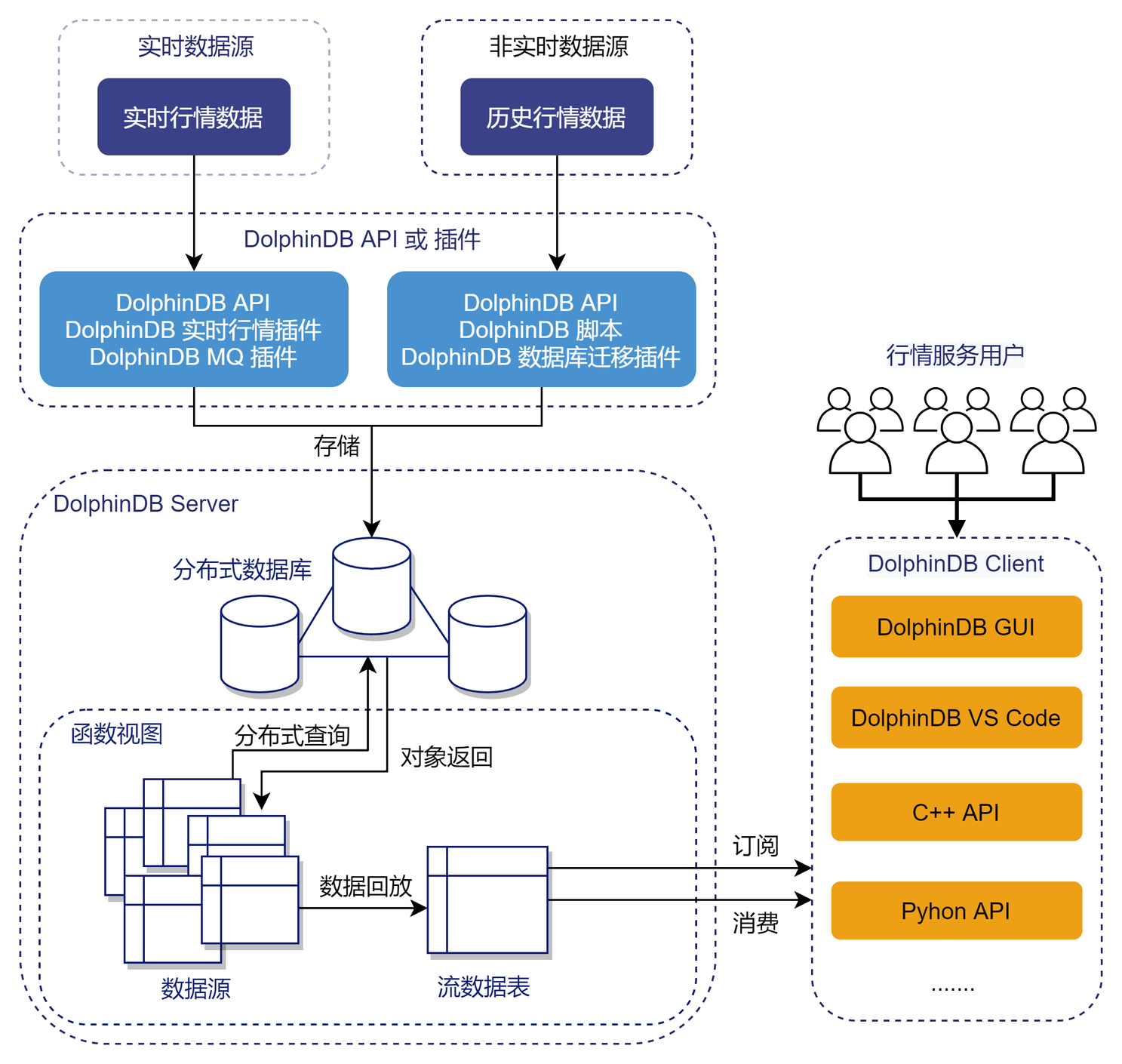 - 行情数据接入:实时行情数据和历史行情数据可以通过 DolphinDB API 或插件存储到 DolphinDB 分布式时序数据库中。