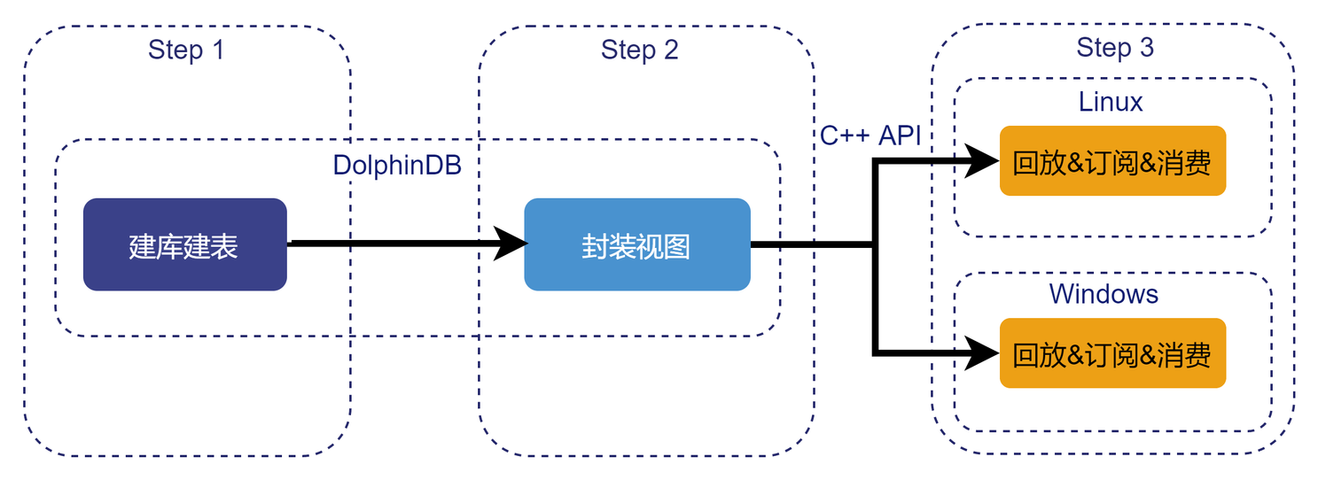 - Step 3:服务提供者在外部程序中通过 DolphinDB API 调用上述函数视图实现提交回放的功能。在第四章将给出 API 端提交回放任务的 C++ 实现和 Python 实现。此外,在第四章提交回放的基础上,在第五章将介绍对回放结果的 API 端订阅与消费的代码实现。