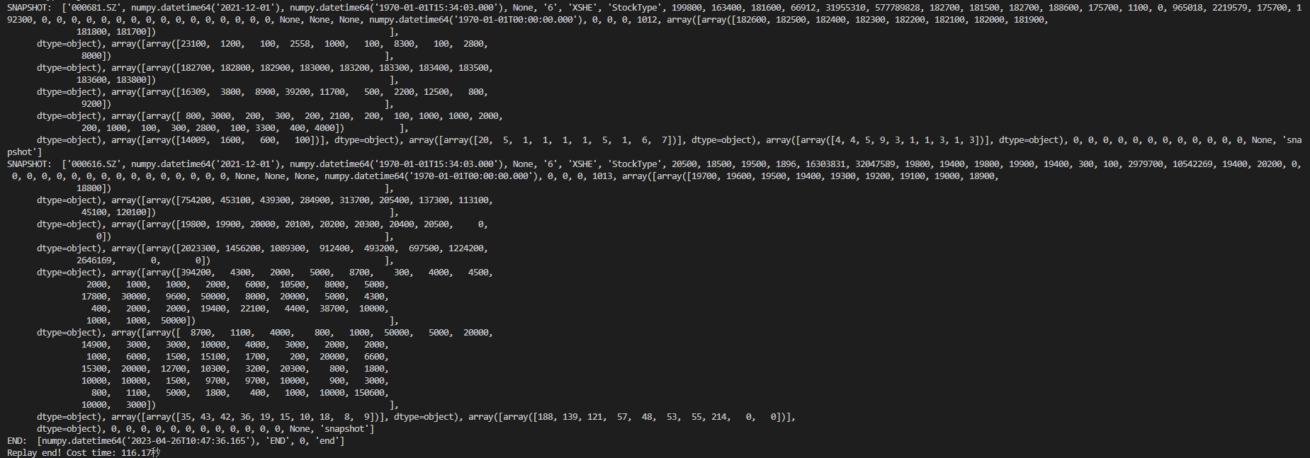 | stkReplay | stkList:回放股票列表startDate:回放开始日期endDate:回放结束日期replayRate:回放速率replayUuid:回放用户标识replayName:回放数据源名称 | 行情回放服务主函数 |