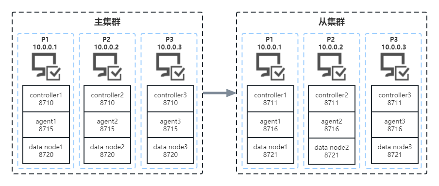 集群间的异步复制支持一个主集群,多个从集群。用户在使用异步复制功能时需要至少部署两个集群,集群类型可为单服务器集群、多服务器集群以及高可用集群。关于如何部署集群请参考单服务器集群部署、多服务器集群部署、高可用集群部署。