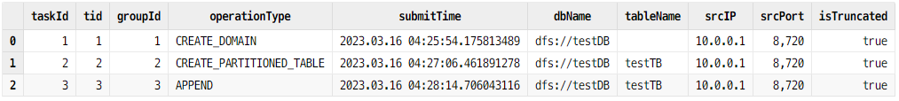 主集群生成了三个异步复制任务,分别对应创建数据库、创建表和插入数据。关于上图中各参数的介绍请参考函数介绍。