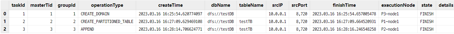 loadTable("dfs://testDB", "testTB")函数执行成功说明从集群中成功创建了数据库 dfs://testDB 和表 testTB。