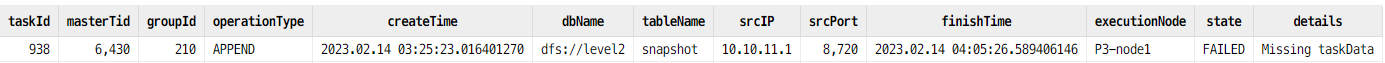 若无法分析失败原因,请联系技术支持人员进行处理。可以暂时跳过失败的任务,继续执行之后的任务,在从集群的数据节点上执行以下语句跳过该任务。