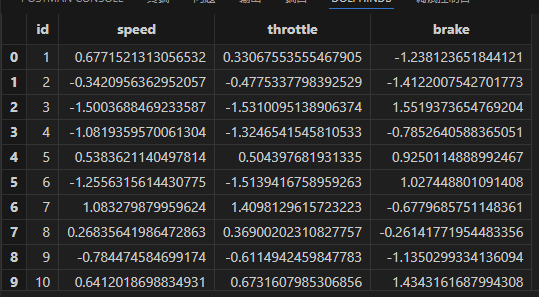 第一步仍然是进行数据预处理和特征提取。首先,使用 iif 函数对数据进行预处理;接着,通过 deltas 函数计算油门和刹车位置的前后差值,并利用 iif 函数对这些差值进行分类,将大于20的差值归类为急刹车和急加速。同样地,通过 iif 函数统计车道前后变化情况,以确定变道次数。完成这些步骤后,按车辆维度聚合数据,提取出速度的标准差、急刹次数、急加速次数和变道次数等关键特征值。获取到特征值后,调用 zscore 函数对数据进行标准化处理: