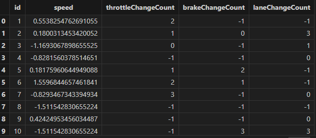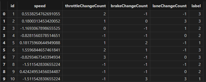 colNames = [`speed,`throttleChangeCount,`brakeChangeCount,`laneChangeCount],
