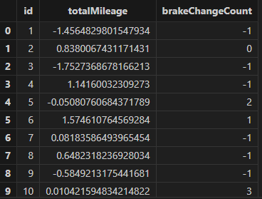 newValues = <[zscore(totalMileage),zscore(brakeChangeCount)]>)