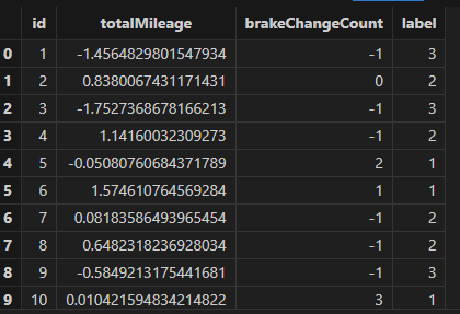 同理也是对数据进行特征提取,并进行模型训练。因为驾驶总里程是一个递增值,因此我们使用 last 函数取最后一个值作为特征值,急刹次数的特征提取同上节。特征提取后进行了归一化处理: