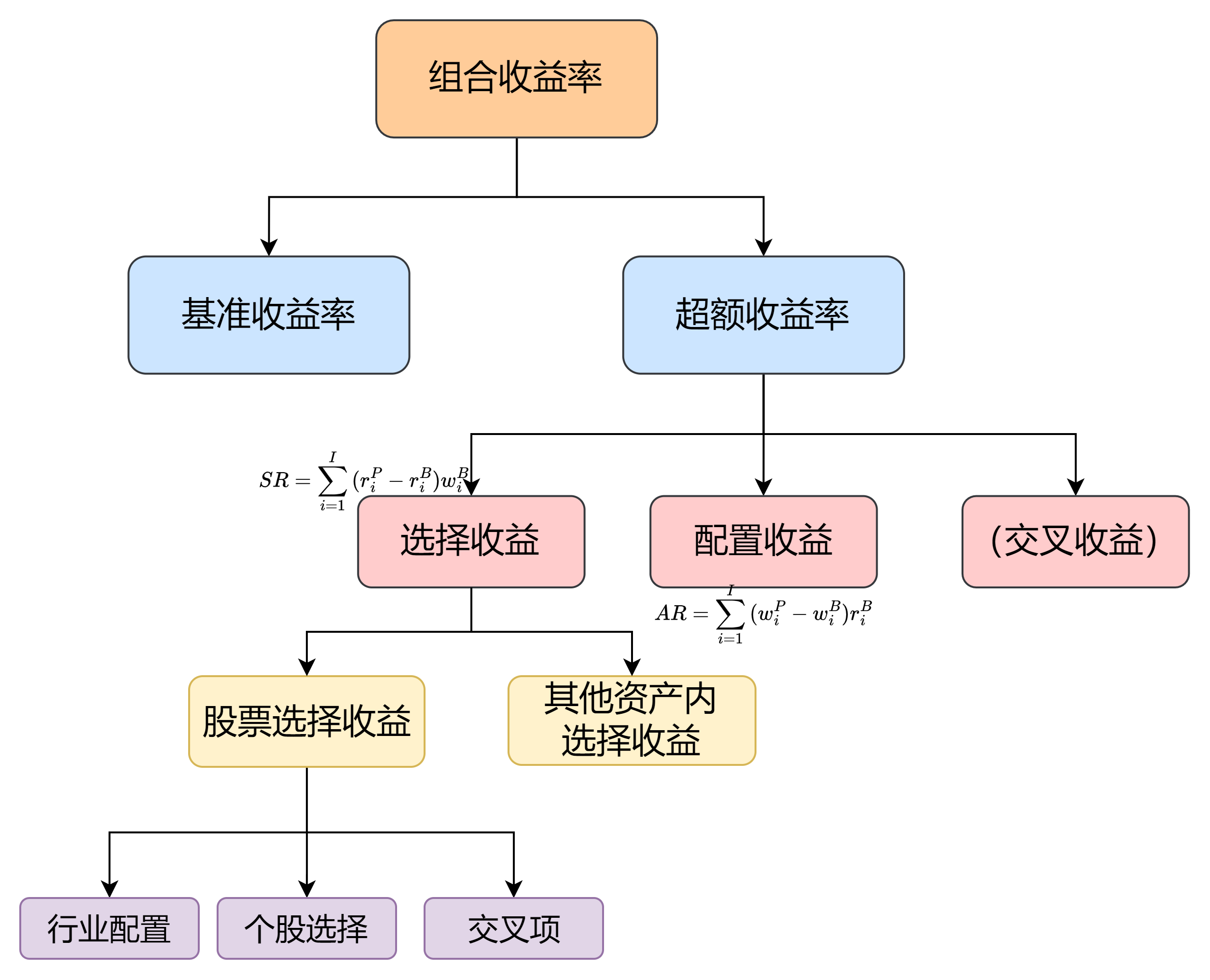 - 选择收益(Selection Return, SR):选择收益衡量基金经理在具体标的选择上的能力。它反映了基金经理选择的个股或债券在相对于基准组合的超额收益。