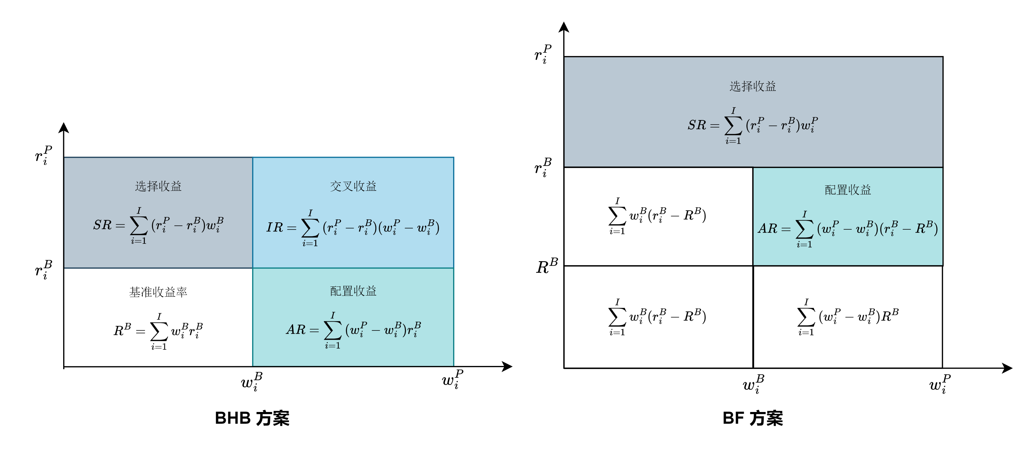 我们可以用图形来更直观地展示 BF 和 BHB 方案的收益分解方式。下图白色部分代表了基准组合的收益,彩色部分代表了基金组合相对于基准的超额收益。