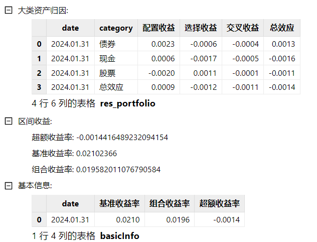 brinson(dailyPosition, benchmarkPosition, marketData, 2024.01.31, method = 'BHB', multiPeriod = false, industryBrinson = NULL, showAll = false)。返回结果如下图所示: