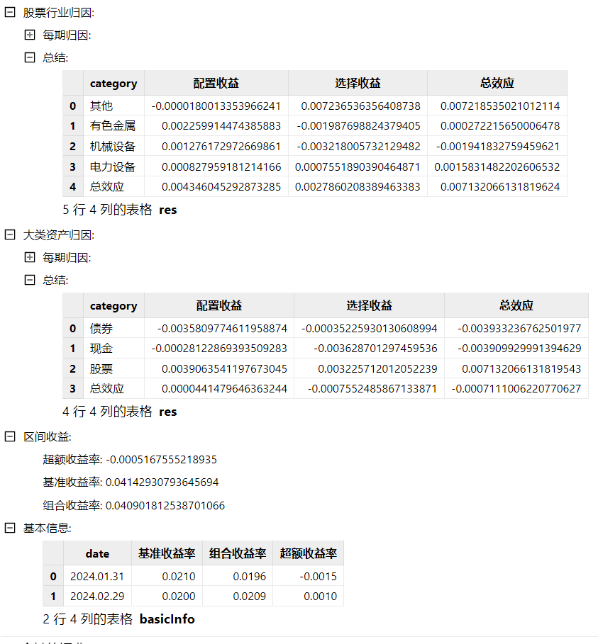 返回一个字典,一定会包含区间收益、基础信息和大类资产归因三个字典。如果 industryBrinson 不为空,则包含基础信息、大类资产归因、行业归因产生的多个字典。