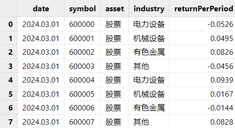 列名 数据类型 备注 date DATE 日期 symbol STRING 标的 asset STRING 大类资产名称 industry STRING 行业类型 returnPerPeriod DOUBLE 常规收益率。为上一个日期到下一个日期间的区间收益率。 dateList 归因日期。DATE[],表示需要归因的日期向量。