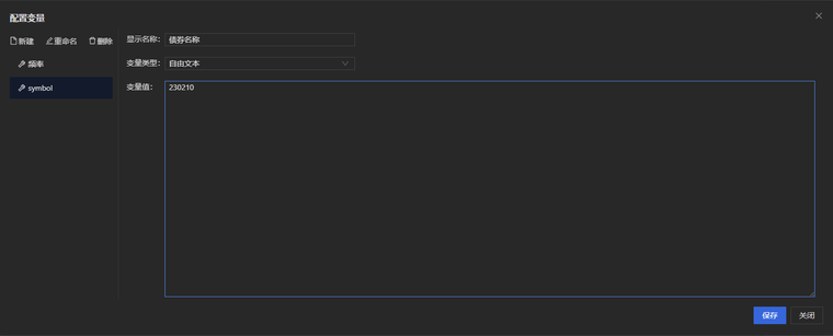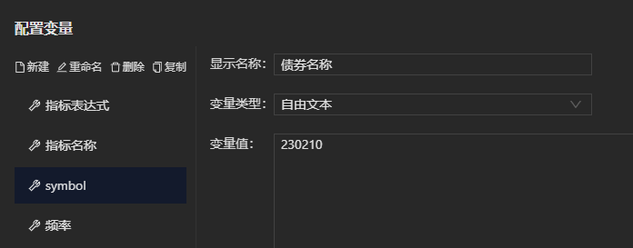 显示名称:指当前变量在图表中显示的名称,如变量symbol,在图表中显示为债券名称。