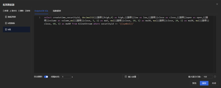 - 数据源:DolphinDB 作为数据层,为其提供数据服务。对 DolphinDB 中的对象,如 DFS 表或流数据表的一个查询,就是一个数据源。