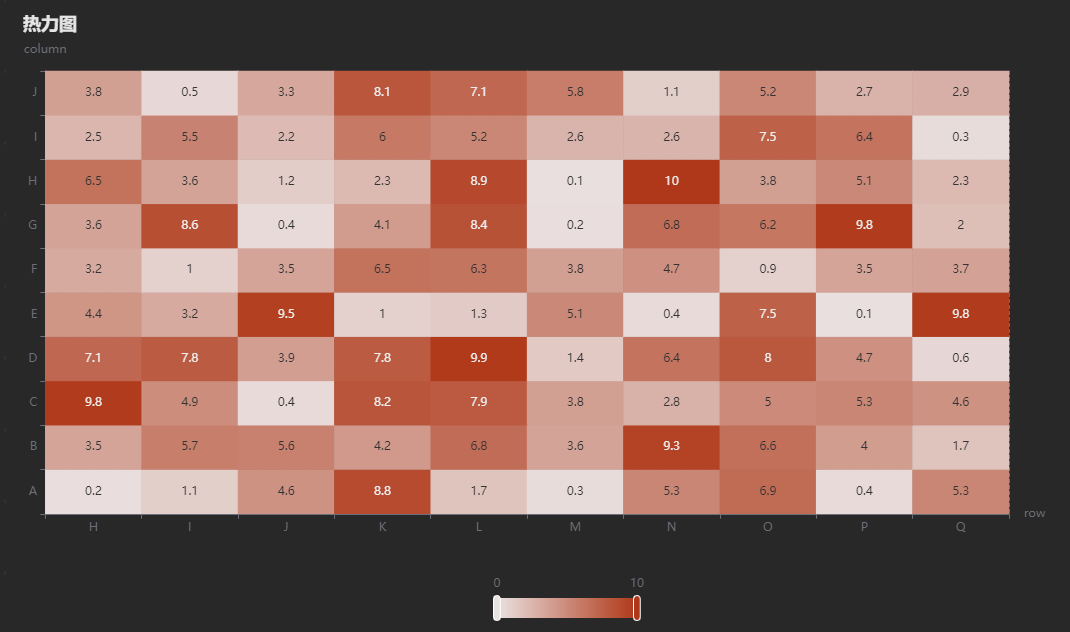 当数据源设置为矩阵形式时,热力图的配置项无需选择数据列与坐标列。图中显示的横纵坐标对应于矩阵的行列标签。