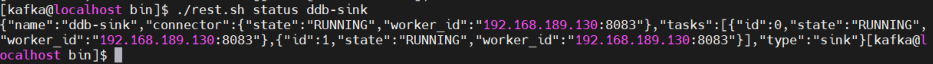 ./rest.sh status ddb-sink每个同步任务包含 1 个 connector 和至少 1 个 task ,如下图所示当前同步任务的 connector 和 task 均为正常运行状态 RUNNING。