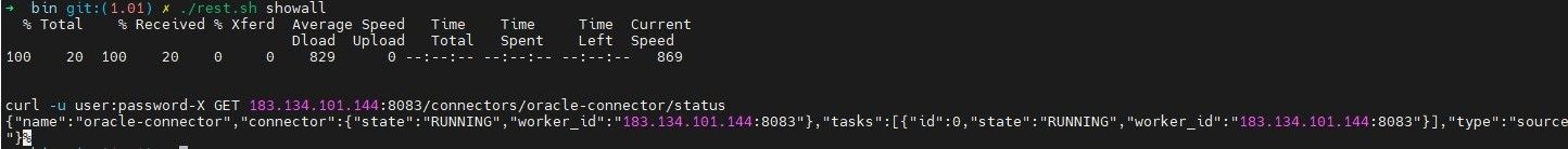 { "name": "oracle-connector", "config": { "connector.class": "io.debezium.connector.oracle.OracleConnector", "tasks.max": "1", "topic.prefix": "oracle_service", "database.hostname": "183.134.101.144", "database.port": 1521, "database.user": "debezium", "database.password": "123456", "database.dbname": "testdb", "database.connection.adapter": "logminer", "schema.include.list": "debezium", "table.include.list": "debezium.index_example,debezium.stock_example", "schema.history.internal.kafka.bootstrap.servers": "183.134.101.144:9092", "schema.history.internal.kafka.topic": "schema-changes.test", "event.processing.failure.handling.mode": "skip", "decimal.handling.mode": "string", "snapshot.mode": "initial", "log.mining.strategy": "online_catalog", "log.mining.query.filter.mode": "in", "log.mining.continuous.mine": true, "heartbeat.interval.ms": "20000", "schema.history.internal.store.only.captured.tables.ddl": true, "schema.history.internal.store.only.captured.databases.ddl": true } }通过封装了 REST API 的脚本启动 Oracle 的 source 数据同步任务: