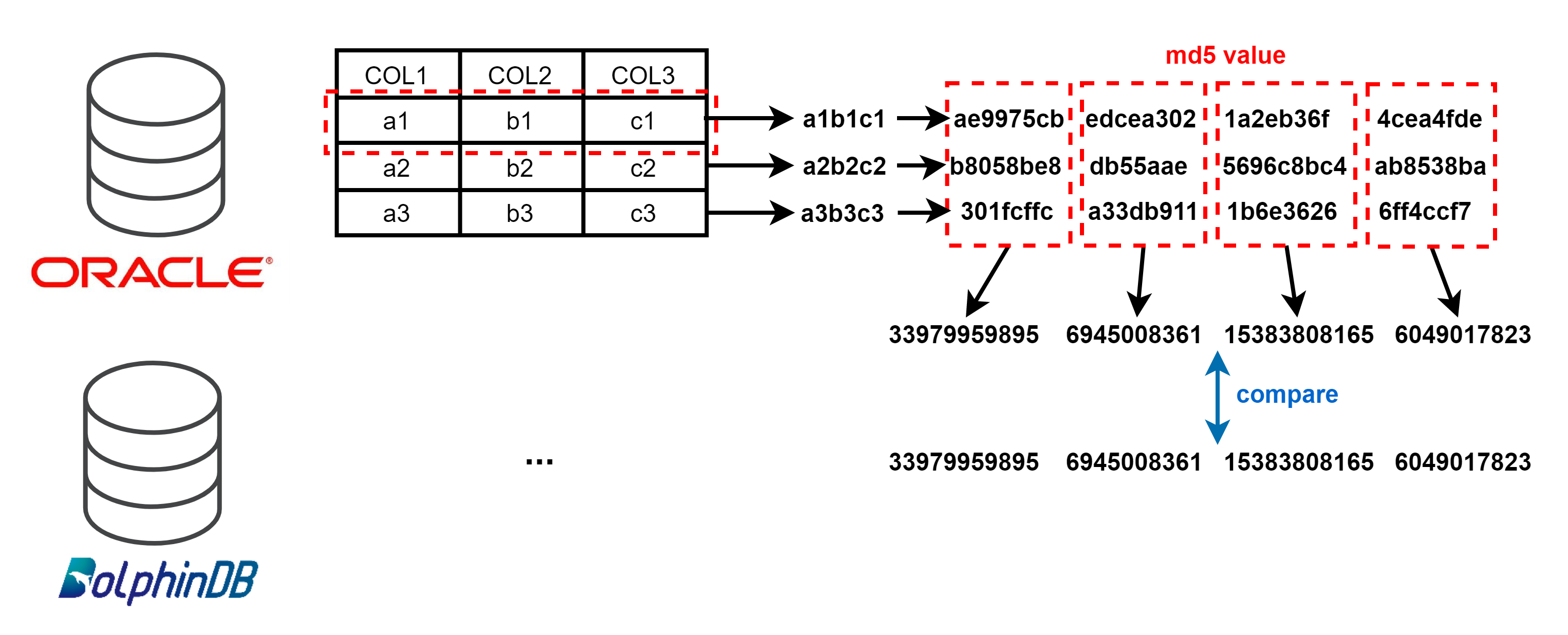 数据校验的原理是将各类型数据按相同规则转换为字符串,根据字符串计算得到 MD5 值,两边数据库只比较MD5 值即可判断数据是否一致。由于字符串长度限制等因素,我们以行为单位计算 MD5 值,并将每行的 MD5 值进行相加再得到最终的校验值。