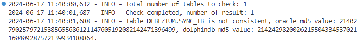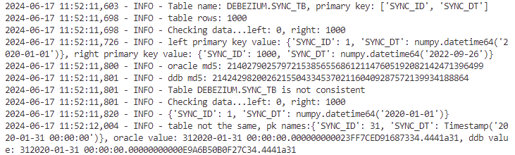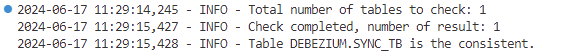 UPDATE DEBEZIUM.SYNC_TB SET SYNC_VAL1 = '9.999' WHERE SYNC_DT = TO_DATE('2020-01-31', 'YYYY-MM-DD')再执行一次校验任务: