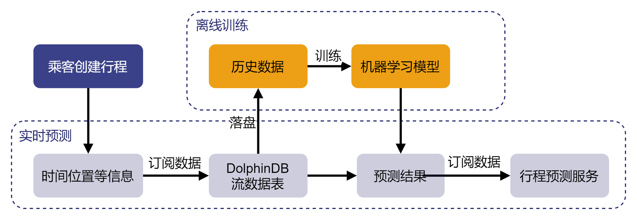 为实现出租车行程时间的实时预测,服务商可以创建 DolphinDB 流数据表订阅服务端消息,获取乘客创建的行程信息,使用离线训练完成的模型对行程时间进行实时预测,最后可通过应用程序订阅预测数据并提供给乘客。